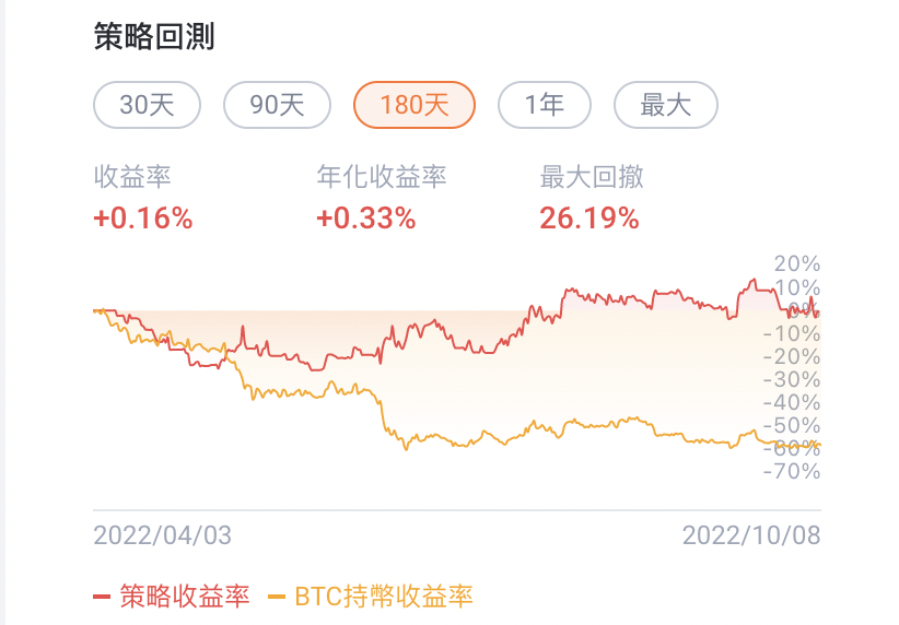 這是近180天的回測,顯示如果是單純持幣,可能會因為震盪下跌而出現大幅的虧損(下跌近60%),
