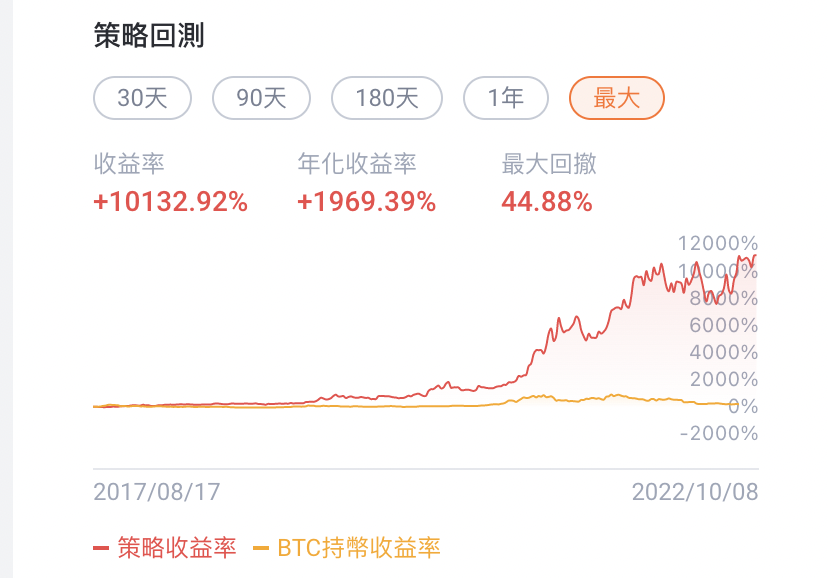 也不過就是獲利10倍左右,但是使用策略操作的績效明顯是遠遠大於持幣的!