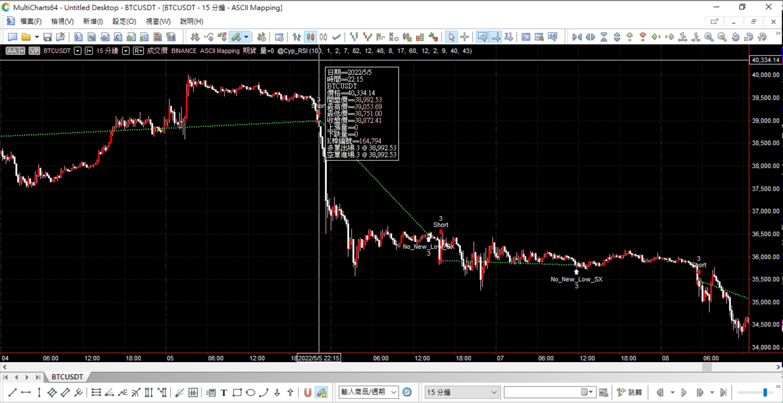 我們可以看到,在5月5號當盤勢在高檔盤整後於22點15分出現殺盤,