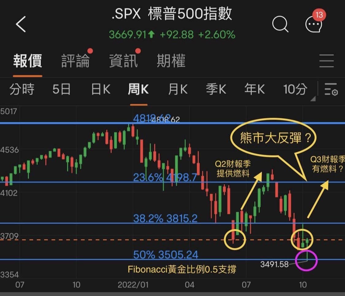 昨天S&P 500開盤觸及 2020年3月低點、2022年1月高點所構成的Fibonacci黃金比例 0.5 支撐後,開啟大反彈。