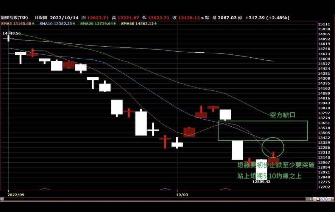 大盤技術面來看,台股未來必需要突破月均線,才能說是短線翻多,否則都只是跌深反彈而已!前方的空方缺口剛好跟月均線在差不多的位置(綠框處)若這二個空方壓力都能順利突破才能短線翻多。如果是像今天這樣連5均線壓力都過不去,短線根本沒有止跌,起碼要把5.10均線給突破(綠圈處)才能出現暫時初步止跌的訊號。