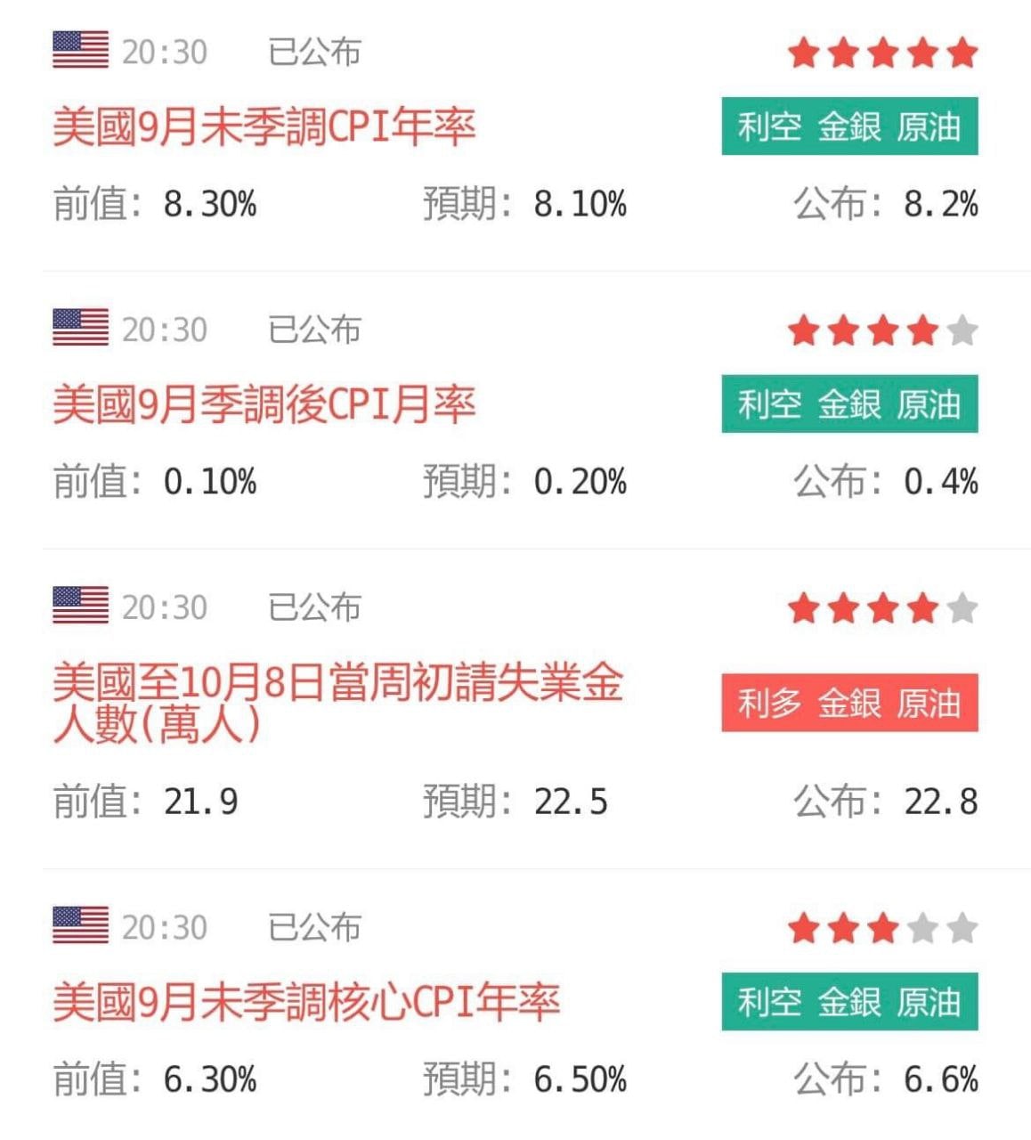 美國九月消費者物價指數CPI年增率8.2%,高於市場預期8.1%⬆️