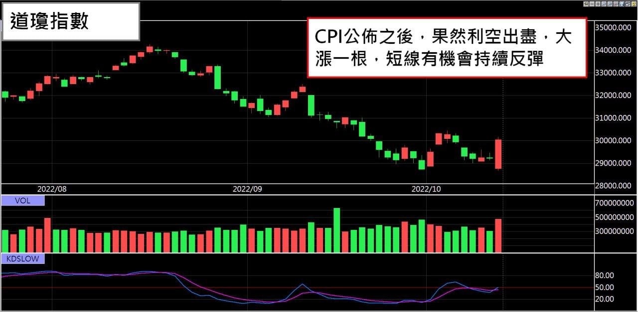 美國CPI消息一公佈,道瓊指數開盤大跌超過500點,失守29000點整數關卡,不過盤中低接買盤進場,帶動道瓊指數出現報復性的大漲,穩穩守住29000關卡,技術面出現『利空不跌』的訊號,短期內有可能持續反彈,預計道瓊指數暫時將在30000點附近來回打底。
