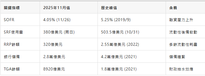 回購市場(repo market)作為全球金融體系的核心組成部分,是金融機構進行短期資金借貸的主要場所。該市場規模約3.2兆美元,主要涉及以美國國債為抵押的隔夜融資交易。回購利率反映了美元流動性的供需平衡,是聯準會貨幣政策傳導的關鍵環節。2025年11月以來,回購市場出現明顯流動性緊縮跡象:擔保隔夜融資利率(SOFR)連續多日超過聯準會聯邦基金利率目標上限,站立回購設施(Standing Repo Facility, SRF)使用量激增至創紀錄水平,總額超過380億美元。這並非季度末窗口效應,而是結構性壓力的初步顯現。