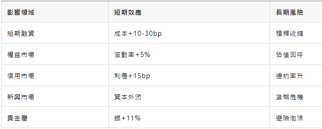 權益市場受間接衝擊:流動性緊縮提升波動率,標普500指數11月回呼5%。加密貨幣先行反應,比特幣10月初見頂,早於股市一月。 貴金屬受益避險:銀價11月28日飆升11%,金價漲3%。