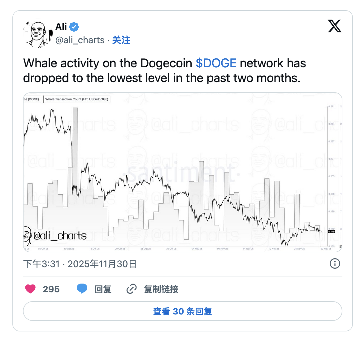 圍繞DOGE的巨鯨活動已降至過去60天以來的最低水平,即使該代幣正顯示出短期反彈跡象。