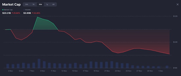 但現實是:即便有巨額資金加持,AI 概念幣依然集體跳水。該板塊總市值已回落至 203.1 億美元,11 月到12 月期間市值縮水 33.28%,跌勢相當慘烈。