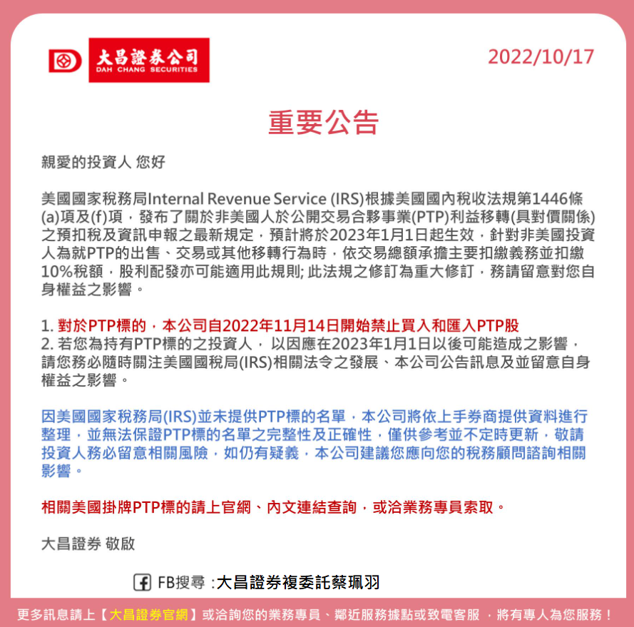 📷複委託美股客戶:2022/11/1起禁止買入美國公開合夥事業(PTP)公開交易商品