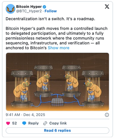 在最新開發更新中,Bitcoin Hyper 團隊還披露了其分階段去中心化路線:先以可控方式平穩啟動,隨後逐步向外部運營者開放排序器與基礎設施,最終過渡為完全無需許可的社區自治網路。