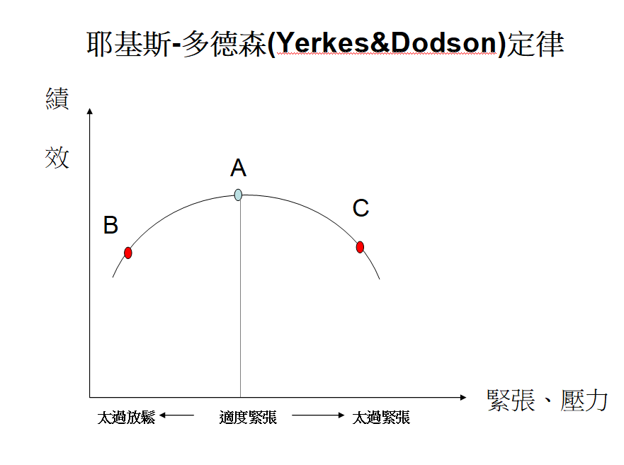 在過度緊張的情況下,表現不會好,例如下圖中的C點。如果可以將緊張程度由C點降低至A點,則表現會更好。如何從C點移到A點的位置?