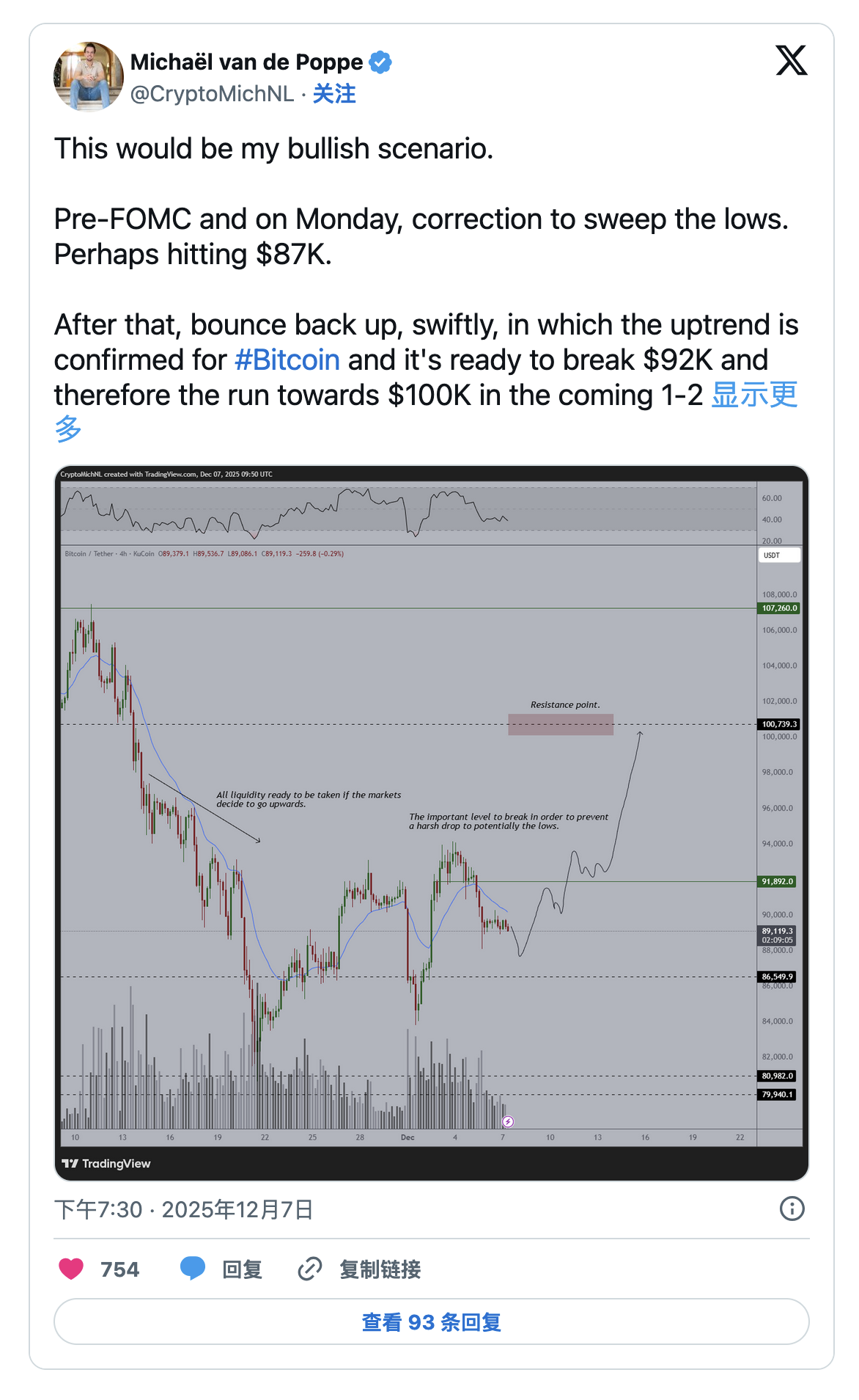 分析師Michaël van de Poppe概述了一個看漲情境,預期短期波動之後將出現持續上漲。他預計FOMC會議前(今日)的賣壓,可能將價格推低至87,000美元,以掃蕩低點的流動性。