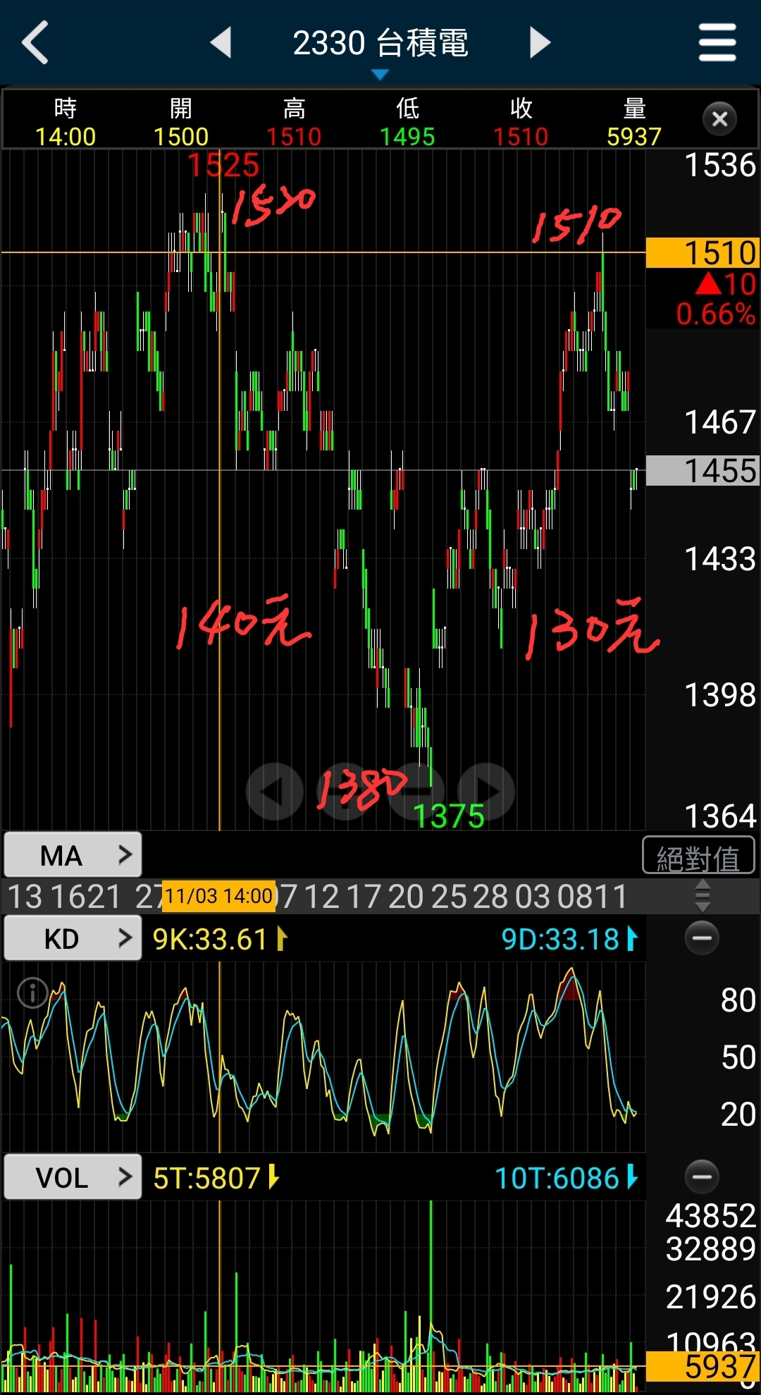 從十月底至今一個半月,台積電1520/1380/1510/摜破1450來回一張就有32萬元價差!