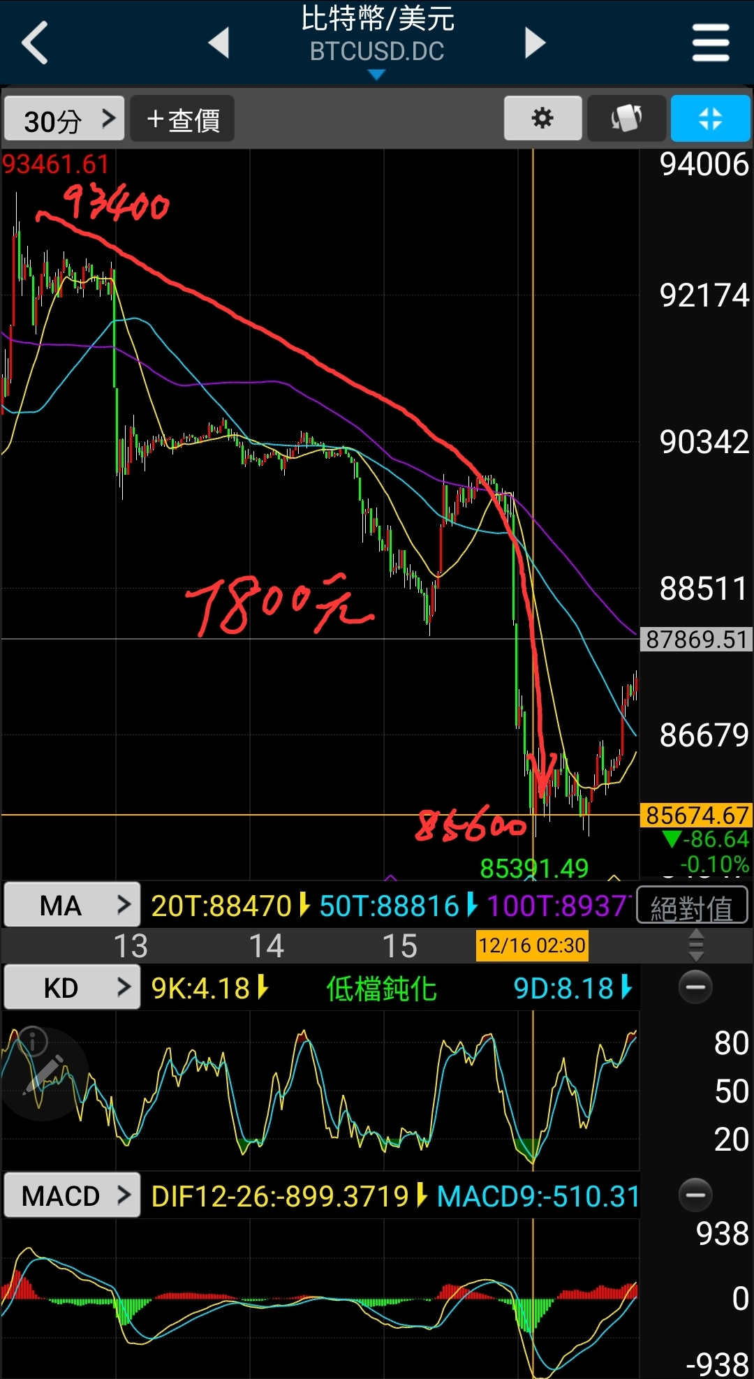 比特幣93400/85600又砍下7800美元價差,