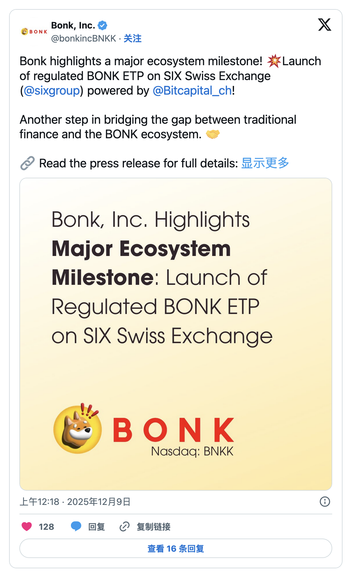BONK 聯手瑞士的 ETP 發行商 Bitcoin Capital,在 SIX 瑞士證券交易所 上線了 BONK 交易所交易產品(ETP)。 SIX 是歐洲第三大股票交易所,這波屬於正經「上大所」。