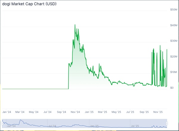 波動性在10 月才重新回歸,而隨著最近這次“噴發式拉升”,DOGI 的市值(market cap)已經站上 2,500 萬美元之上,隱約閃現出當年那波動能的影子。