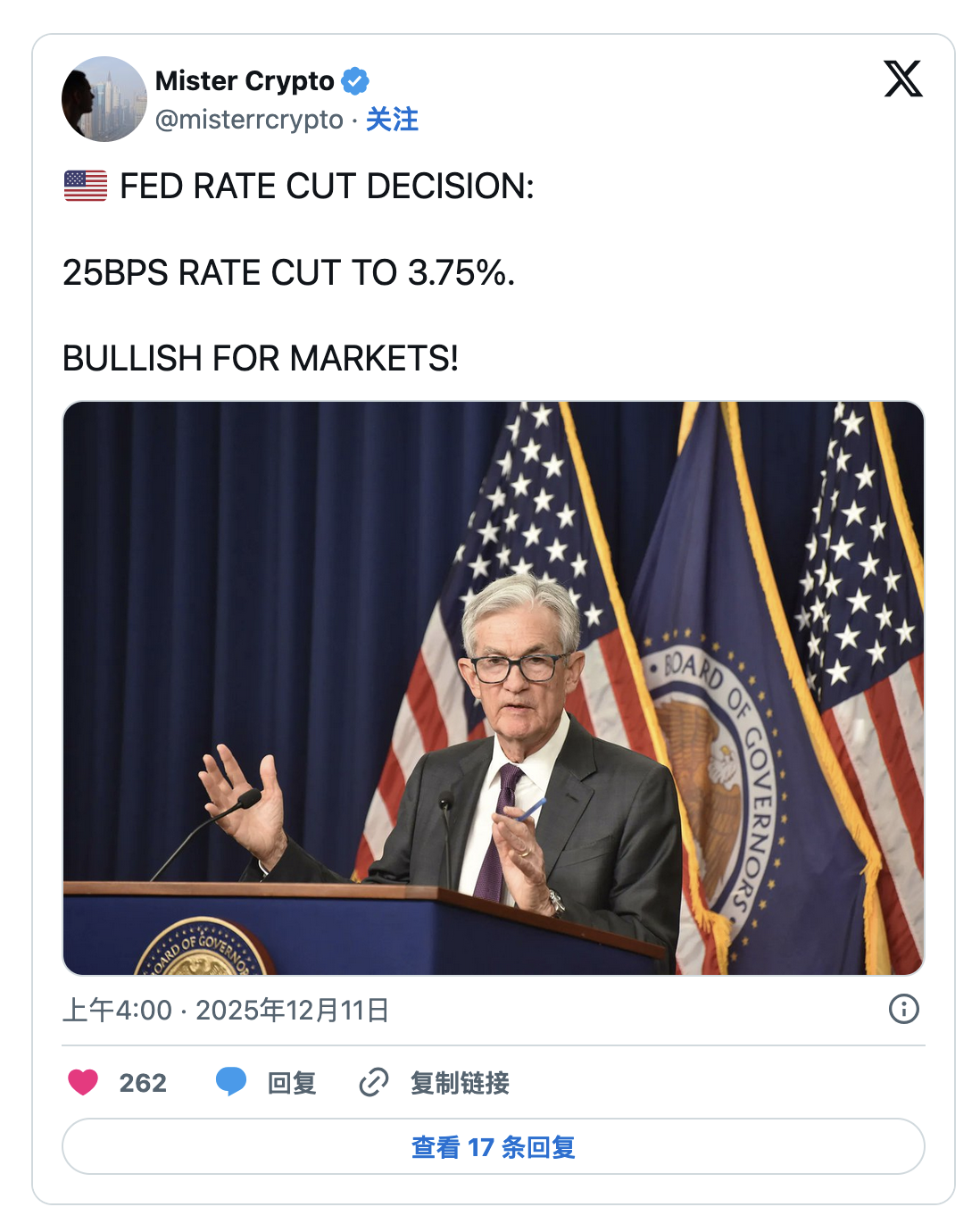 Kobeissi分析師強調,聯儲局將於12月12日開始購買美國公債票據,並計劃在30天內收購價值400億美元的票據。這代表直接向金融系統注入流動性,而非紙面上的量化寬鬆,這可能引發風險資產如比特幣的實質上漲。