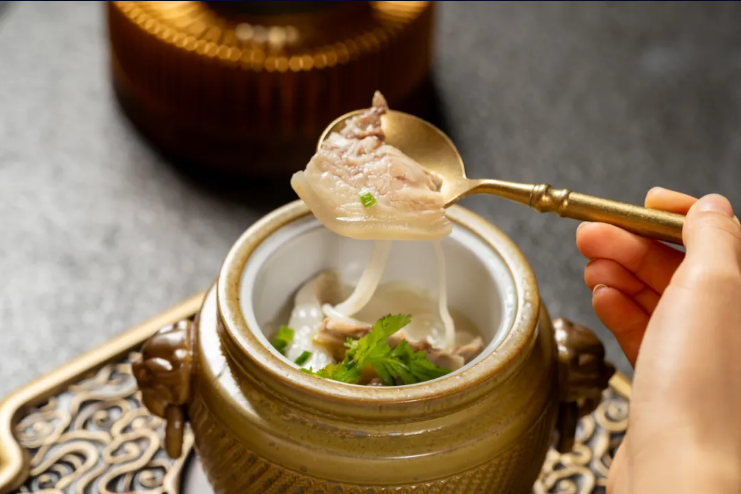 宴席伊始,一盞石斛乳鴿清湯奉上。食材隔水慢燉,湯色澄澈如玉,鴿肉軟糯脫骨。入口溫潤鮮醇,石斛微甘縈繞舌尖,一股暖流自上而下,恰似《鹿鳴》詩中描繪的賓主和樂之情。