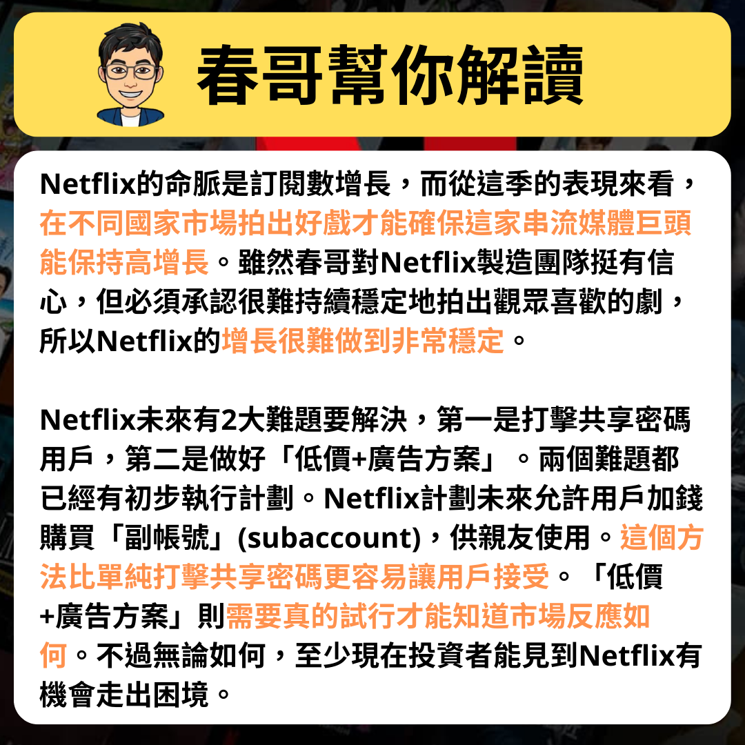 Netflix財報重點+技術面分析|意外重拾增長?打擊共享用戶和廣告方案進度如何?