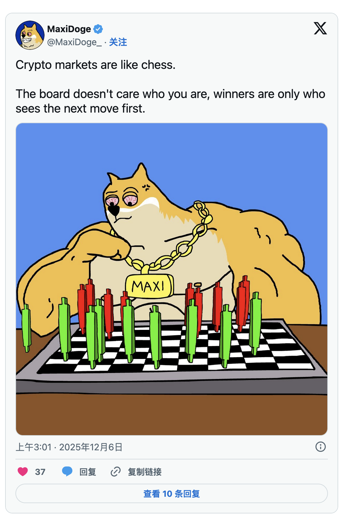 這正是 Maxi Doge 拉開差距的地方。從品牌調性、吉祥物設定、敘事風格,到那種毫不收斂的高分貝噪音,一切都是為了搶佔注意力而設計——而這已經不是現在的 DOGE 能做到的了,就算背後還有馬斯克時不時扶一把也是一樣。