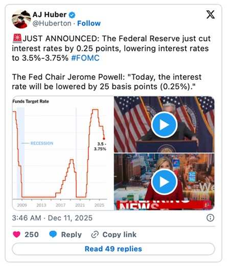 美聯儲週三的這次降息,是連續第三次下調利率,交易員們現在基本把它當成邁向 2026 年潛在寬鬆週期的起點。
