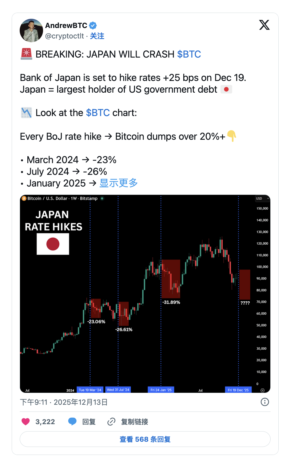 在12月13日的X貼文中,該分析師檢視了比特幣圖表,並指出一個一致的模式:每次日本銀行的利率上調前,都會引發比特幣跌幅超過20%。