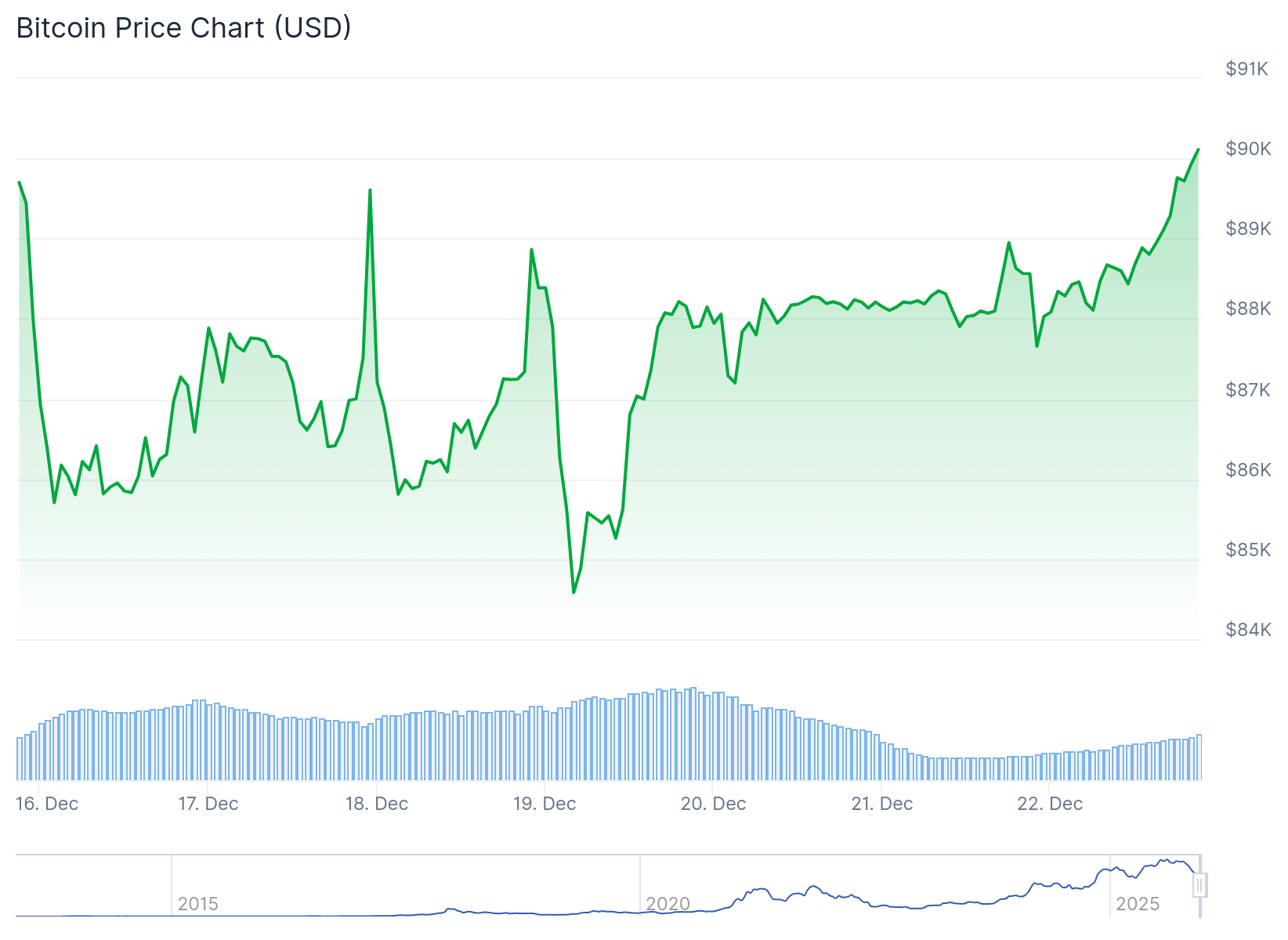 比特幣(BTC)於週一早盤回升接近90,000美元,重燃市場對年底可能出現季節性「聖誕行情」(Santa Claus Rally)的預期。