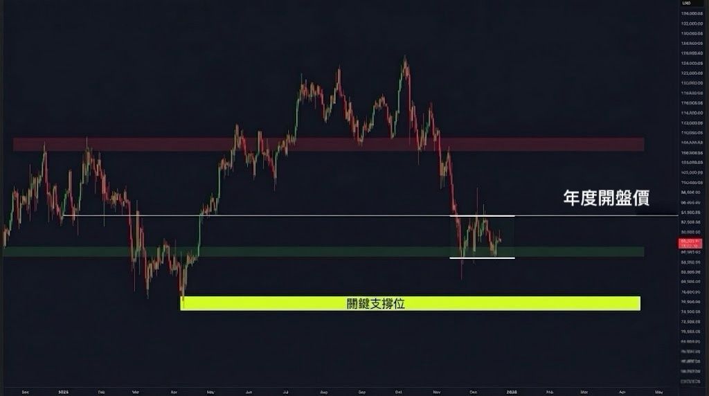 盤整框上沿大致落在93,000至94,000一帶,同時疊加圖中標注的年度開盤價。這類年度基準線兼具心理與技術含義,因為它天然成為多空評估年度強弱的分水嶺。價格多次上探後回落,反映上方供給仍重,短線買盤未能形成連續性的接力,因此每次靠近上沿都更像測試賣壓,而非趨勢回歸的確認。