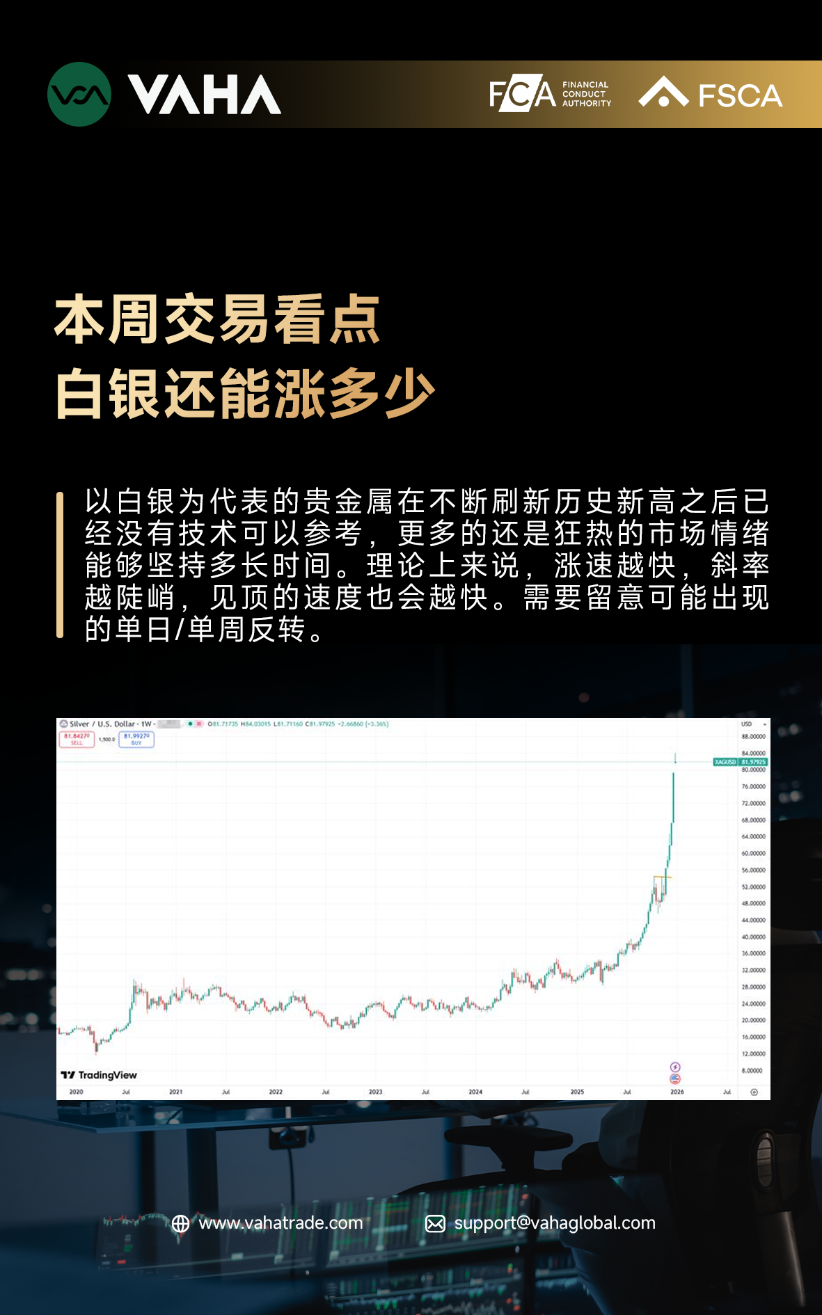 贵金属市场(黄金除外)的疯狂表现已经成为近期一段时间最为火爆的话题。尽管所有人都知道这种接近九十度的上涨不可持续,也知道几十年的白银历史已经出现过几次类似的大起大落,但是依然无法精准的判断市场什么时候,因为什么出现转折。尽管如此,本周在元旦假期穿插下,白银还有多少空间以及是否有变局还是值得持续关注。