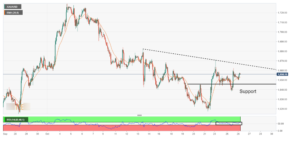 在一小時圖級別上,金價跌破週四高點1,640.55美元以來的水準支撐後大幅回升。自10月13日高點1,682.53美元以來的下降趨勢線充當金價的重要阻力。