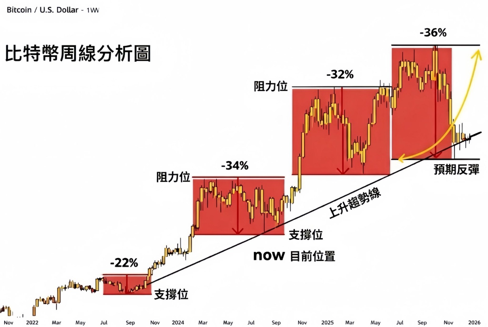 黑色上升趨勢線把多次回撤低點串起來,等同於多頭結構的支撐軸線。它不是精準的買賣訊號,而是判斷趨勢是否仍在的分水嶺。只要週線仍能圍繞這條線震盪並維持擡升結構,市場就更像是在做趨勢內整理,而非進入反轉。