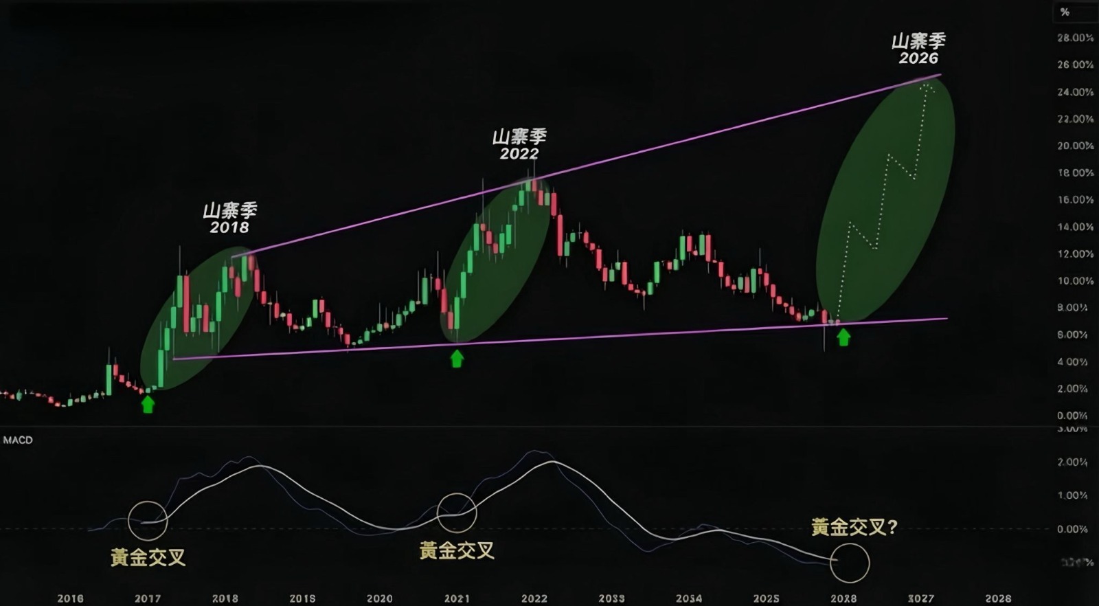 把結構與動能疊在一起,圖表作者用綠色橢圓圈出過去每次「下軌回彈加MACD轉強」後的加速段,並以右側虛線描繪未來路徑,指向2026年前後的山寨季高潮。