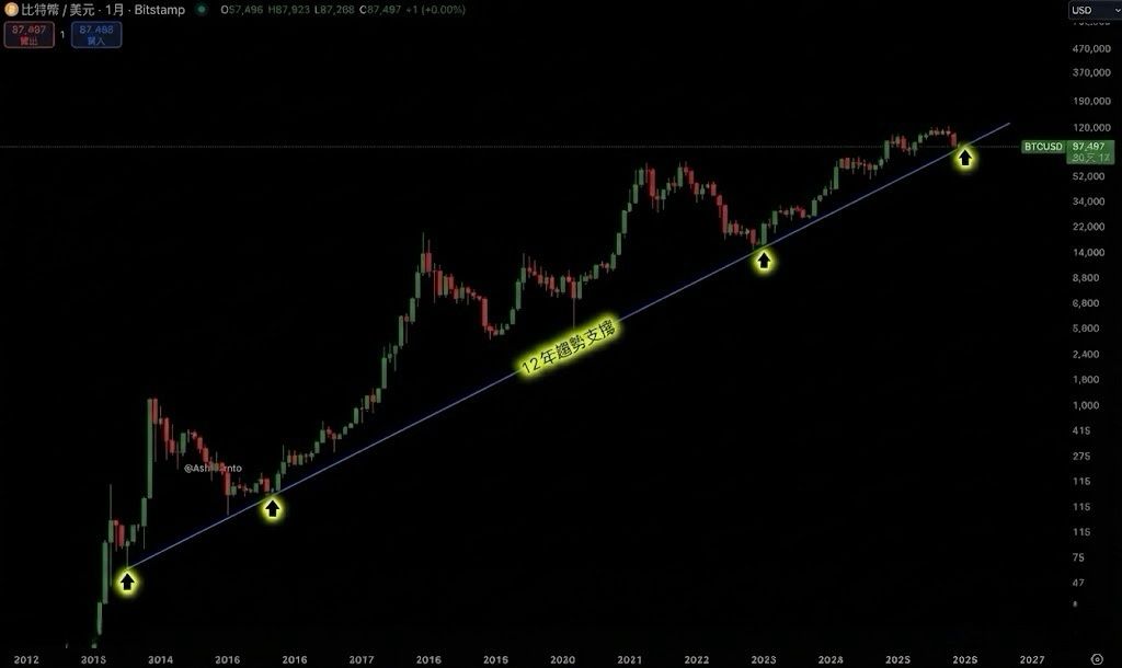 2026年多頭正式爆發,關鍵不在於短線K線的起伏,而在於這條12年宏觀趨勢線能否再次提供支撐 歷史告訴市場,這種級別的長週期測試一旦確認有效,後續通常不是小反彈,而是把估值曲線重新抬高的一段行情。