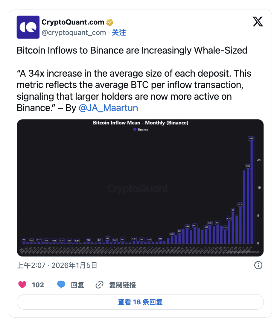 流入交易所的平均交易規模已從年初的約8-10枚比特幣,顯著上升至近期的22-26枚比特幣,顯示大額持有者正將「可觀數量」的比特幣轉移至交易平台。