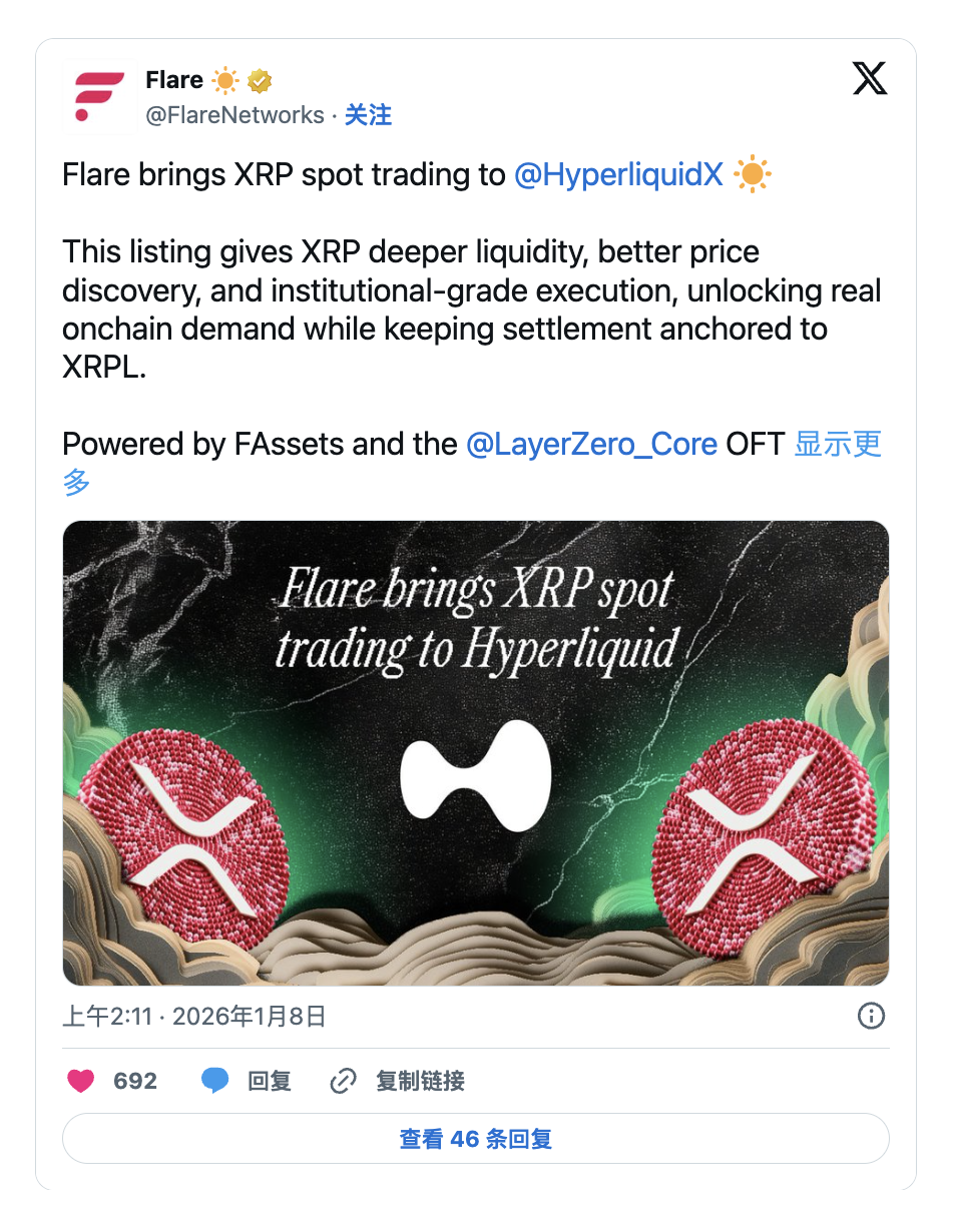 根據 Flare 的官方聲明,此次上線標誌著 XRP 首次在 Hyperliquid 上獲得交易敞口,使 FXRP 登陸當前流動性最強的鏈上交易平台之一。