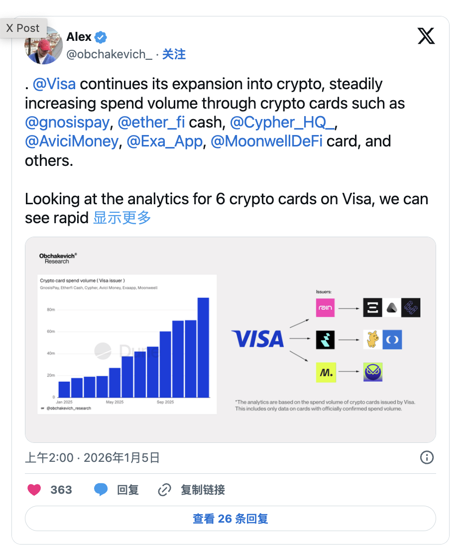 2025年,Visa發行的加密貨幣卡支出呈現爆發式成長,全年淨交易額飆升525%,顯示鏈上支付產品正日益成為消費者日常消費的「主力交易對」。