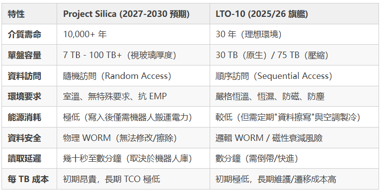 將 Project Silica 與當前工業界主流的 LTO(線性磁帶開放協議)進行對比,可以清晰地看到兩種技術在"時間維度"和"經濟模型"上的顯著差異。