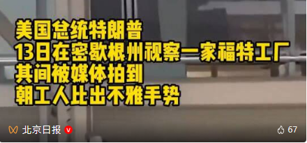 據新華社消息,美國總統川普1月13日在密歇根州視察一家福特工廠時被拍到朝工人比出不雅手勢。白宮隨後辯稱,這是川普對一名咆哮者的“恰當”回應。