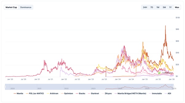 然而,這一模式能否長期成功的核心,取決於其應用層(DApp)的繁榮程度。這種邏輯在乙太坊生態中已經得到了驗證:像 Mantle (MNT) 和 Polygon (POL) 這樣的頂級 L2 選手,通過分擔主網壓力,已經累計瘋狂吸金超過 40 億美元的總鎖倉量(TVL)。