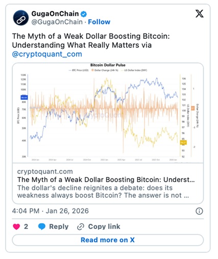 正如分析師 GugaOnChain 所指出的,美元走軟只有在風險偏好擴張的環境下才能有效助推 BTC,而非在由恐懼主導的市場中。