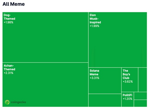 如前所述,Meme 幣在過去24 小時內集體走強。其中,Murad 概念幣以3.8% 的漲幅領跑,青蛙系代幣以 3.7% 緊隨其後。