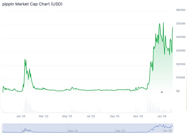 儘管在接下來的一年裡,這一 AI 概念幣在收復失地時顯得有些吃力,但在 12 月份勢能重新回歸。隨著 2026 年開局步入牛市行情,PIPPIN 的估值中樞不斷上移,價格幾乎較此前高點翻倍。近期沖高至 0.4919 美元,將其市值推升至約 4.89 億美元,創下其歷史上最強勁的漲幅之一。