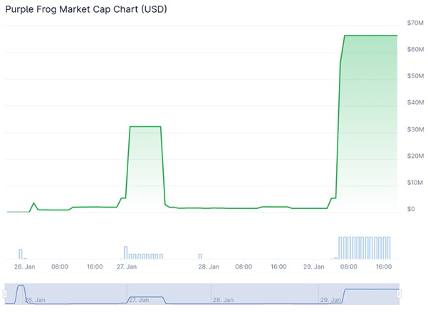 在 Meme 板塊哀鴻遍野的一片血洗中,Purple Frog (PF) 卻逆勢拉出了一根沖天大陽線,一夜之間暴力拉升 4,602%。