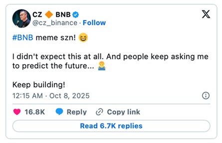 去年 10 月初,CZ 一句 “BNB meme szn!”(BNB 模因季)直接點燃了幣安系代幣的引信。Binance Super Cycle (BSC) 漲幅超 24,000%,而“客服小何”(意為 Binance Life)更是在 24 小時內飆升了令人咋舌的 54,000%。
