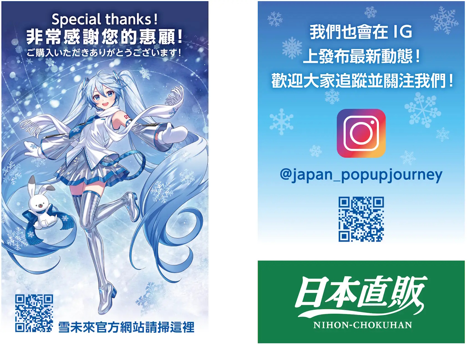 Nihonchokuhan Inc.(總公司:東京都港區,代表取締役社長:水谷 彰孝 (Akitaka Mizutani) / 以下簡稱Nihonchokuhan)作為從過往的綜合郵購事業,朝向以「娛樂、全球化、數位轉型」為核心的「綜合服務(WEB3.0)」企業轉型的一環,將於在台北舉辦的「2026第14屆台北國際動漫節(全日本內容專區)」中,設立 「初音未來(SNOW MIKU)」限定快閃店。展期為2026年2月5日(星期四)至2月9日(星期一),共計5天,地點為台北南港展覽館1館。