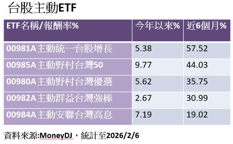 統計至2026/2/6,台股近1年漲幅36.3%、近6個月漲幅35.5%,今年以來漲幅9.7%。比較台股主動基金、被動ETF、主動ETF中的前十大領先群,還是台股主動基金表現遙遙領先,成為各類台股產品中的大贏家。