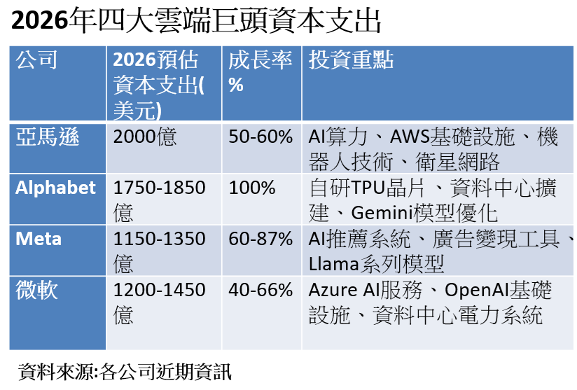 根據最新美國雲端服務公司公布的訊息,今年資本支出金額高達6500億美元,比去年3810億美元大幅成長近7成。雖然最近美國資本市場擔心,雲端公司的大幅支出會侵蝕獲利,但是台灣企業身為雲端巨頭的主要產業供應鏈,卻可以大大受惠於資本支出增加,持續衝高營收與獲利。