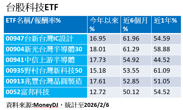 在所有台股ETF中,科技ETF表現最為突出,以近6個月績效比較,比市值型ETF領先10-15%左右。其中,近半年科技ETF的排名順序有些變動。去年表現較佳的00881(國泰台灣科技龍頭)、00894(中信小資高價),近期稍微落後,反而00947(台新台灣IC設計)、00904(新光台灣半導體)等以半導體為主的ETF表現較為超前。主要原因是持有較多記憶體相關個股,而近半年來記憶體股價呈現飆漲走勢。