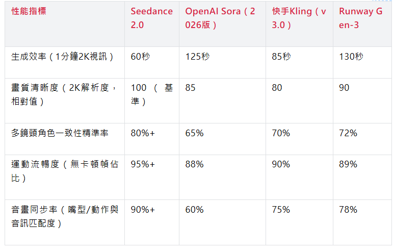 關鍵性能指標是模型實力的“量化體現”,本次選取“生成效率、畫質清晰度、角色一致性、運動流暢度、音畫同步率”五大核心量化指標,結合2026年2月最新實測資料,對四大模型進行橫向對比,所有資料均基於“2K解析度、1分鐘多鏡頭敘事視訊”的相同測試條件,確保資料的可比性。具體對比如下(資料越高,性能越優):