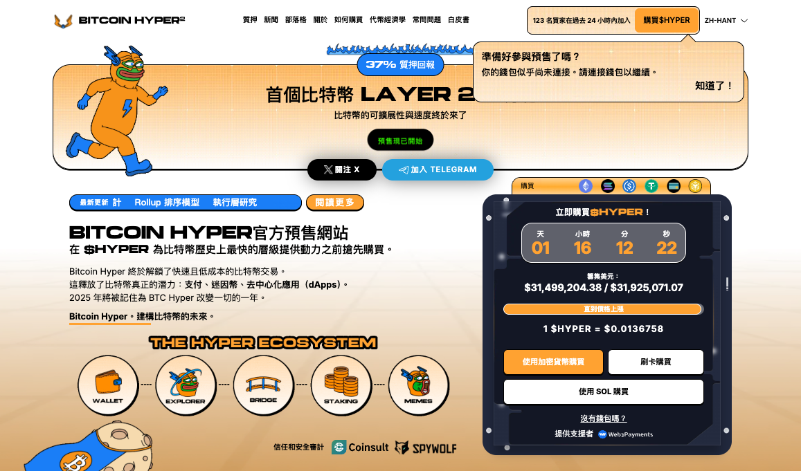 Bitcoin Hyper成為另一條熱線,預售頁面顯示募資規模達3,144萬美元,代幣價格進入0.0136758美元的新階段,調價倒數剩下1天6小時,並在24小時內新增超過123位投資者買盤,反映增量資金仍在進場。