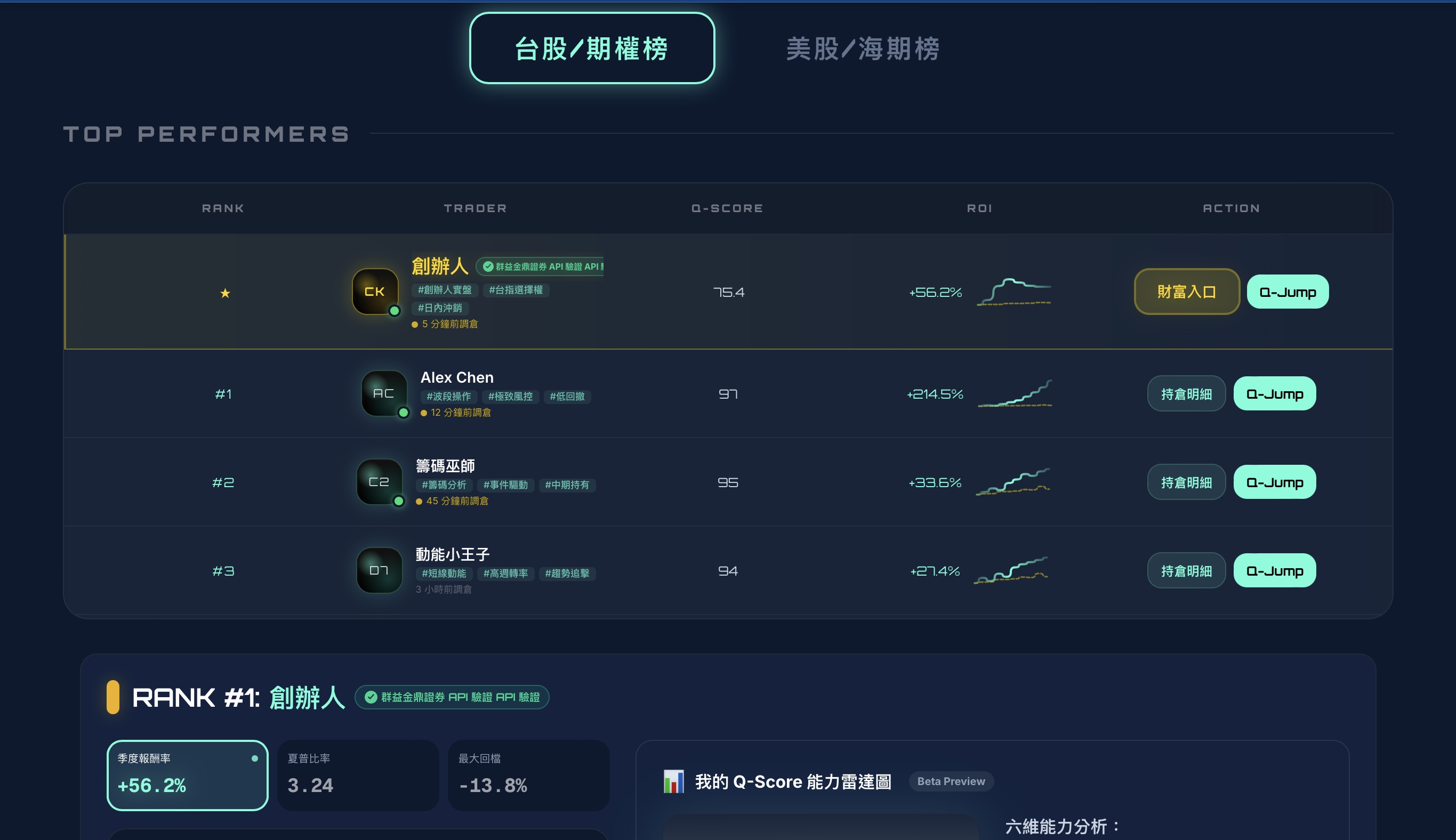目前台股榜前三名:Alex Chen Q-Score 97、ROI +214.5%;鷹碼巫師 Q-Score 95、ROI +33.6%;動能小王子 Q-Score 94、ROI +27.4%。